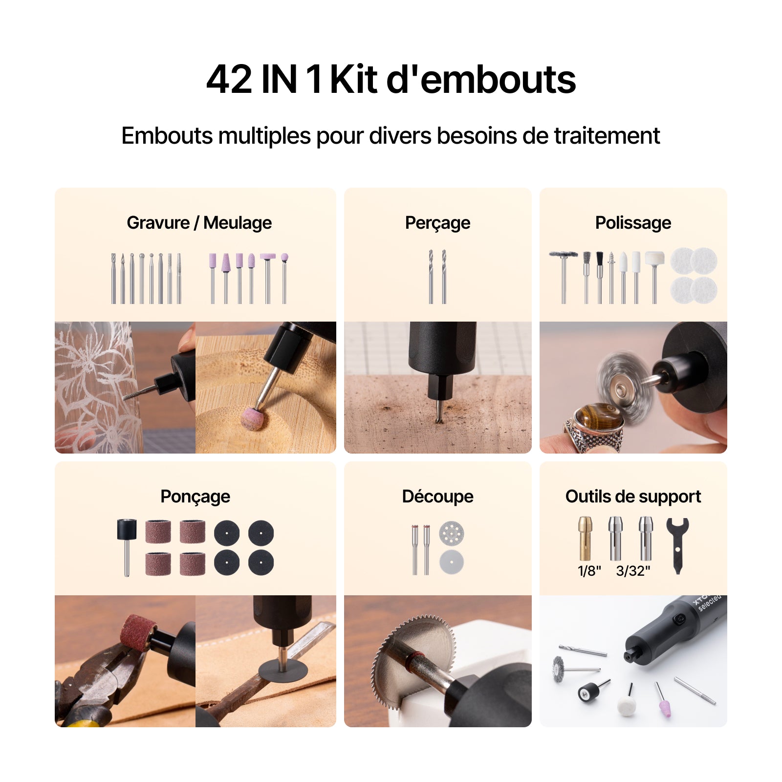 Un total de 44 accessoires dans un seul paquet répond à vos besoins de meulage, polissage et découpe, offrant une large gamme d’options et une grande flexibilité.