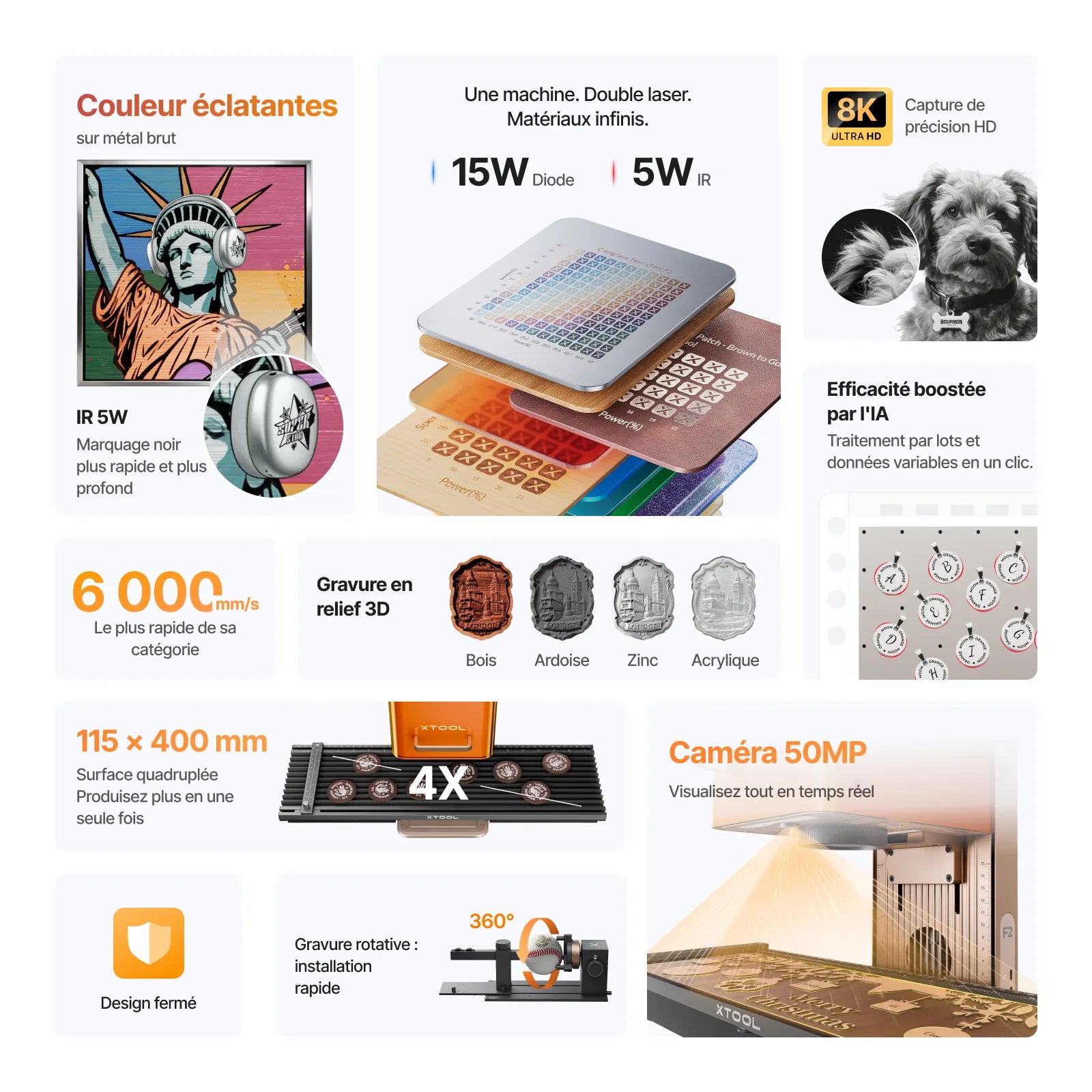 - Écosystème complet : xTool propose une gamme complète d'accessoires, des modules rotatifs aux extensions coulissantes en passant par les purificateurs d'air de bureau, afin que le F2 puisse évoluer avec vos besoins et garantir une utilisation plus sûre.
