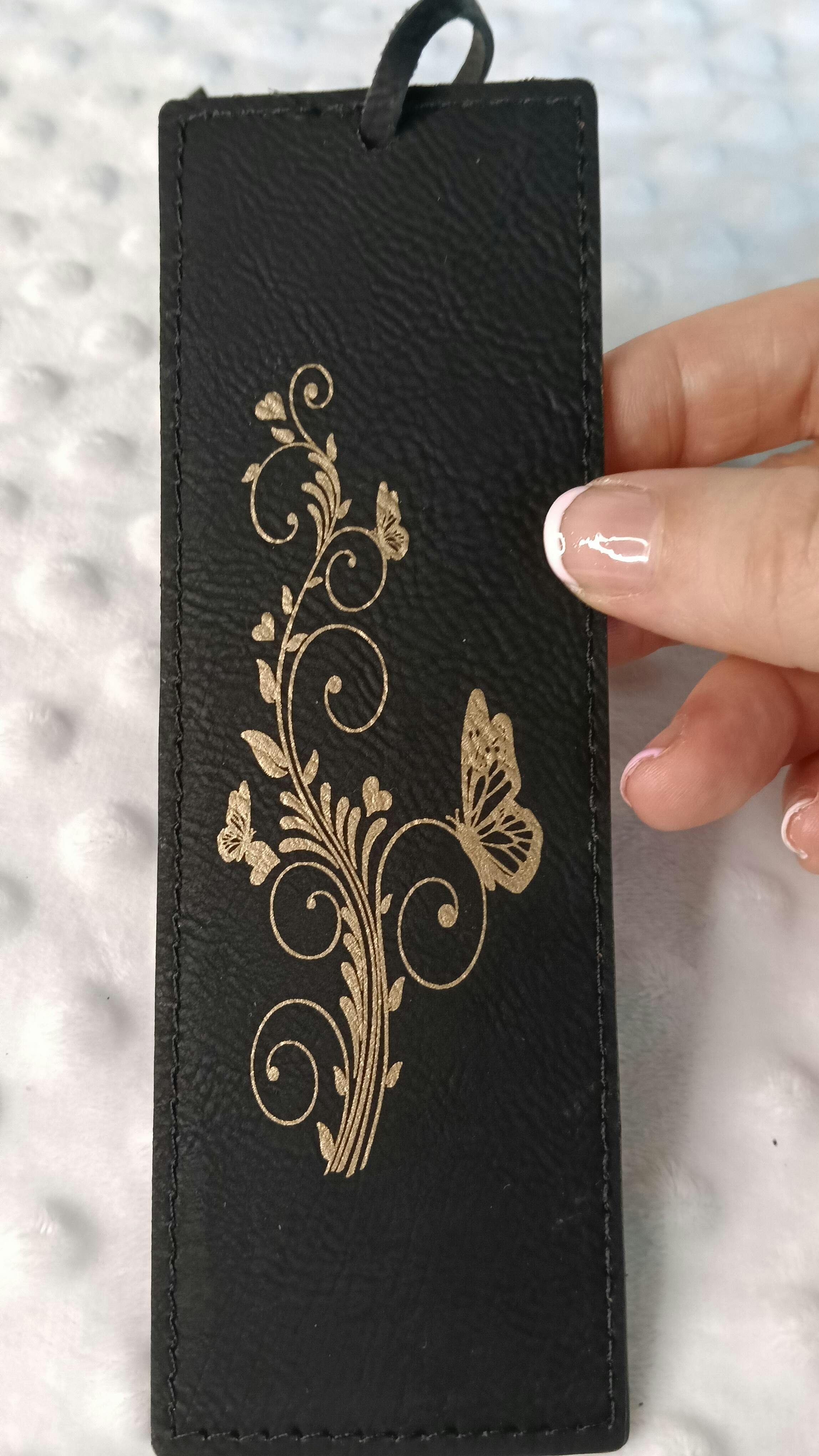 - Gravure exquise : Présentant une forme rectangulaire avec une surface ornée de patches en cuir noir et marron. La zone gravée présente un effet doré et argenté.