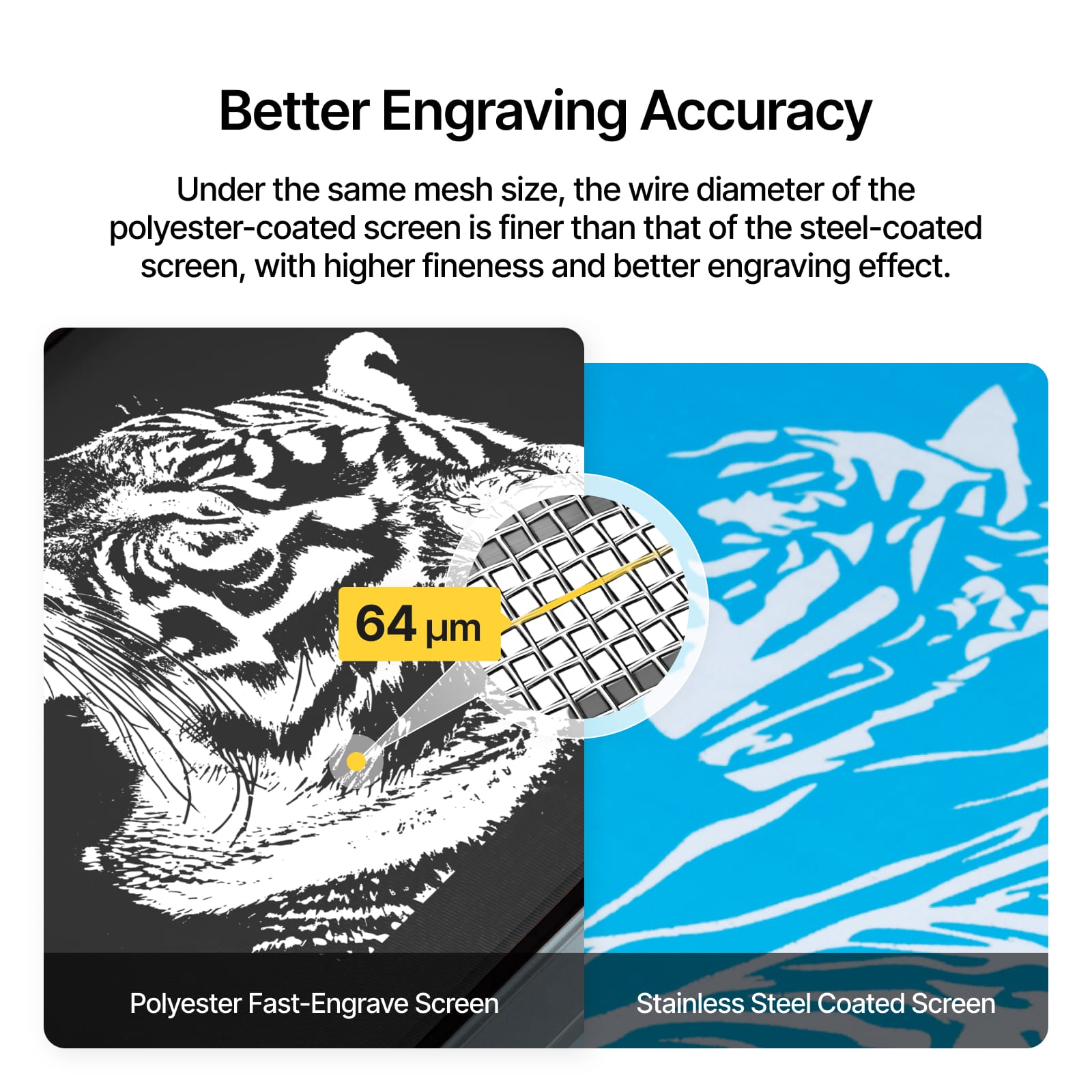 Traitement efficace : Les écran polyester à gravure rapide prennent beaucoup moins de temps à traiter que les planches d'écran traditionnelles avec le même modèle xTool et la même puissance, avec un temps de traitement moyen de gravure de seulement 1 à 30 minutes, contre 5 à 60 minutes pour les planches d'écran traditionnelles. Cela entraîne une augmentation significative de la productivité, vous permettant de terminer vos travaux d'impression plus rapidement.