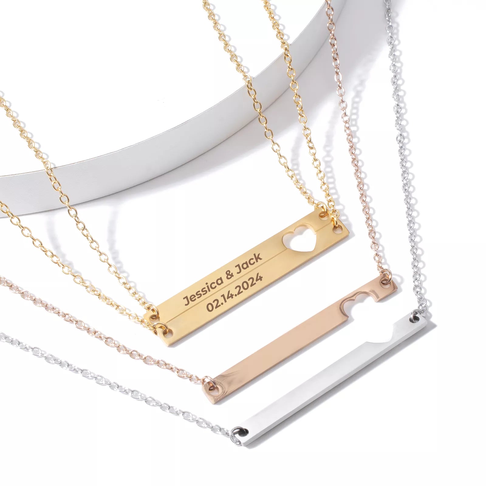 - Disponible en argenté, doré et or rose, chaque collier est fabriqué en acier inoxydable 304 et orné d'un plaquage en or 18 carats. Cela garantit non seulement un aspect luxueux, mais aussi une grande durabilité.