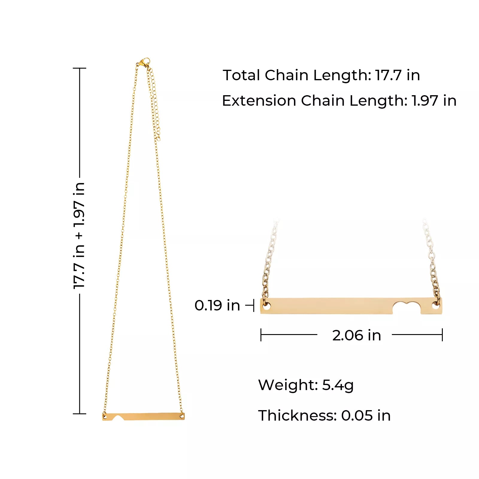 - La longueur de chaque plaque est de 5,2 cm x 0,5 cm. La chaîne mesure 45 cm, avec une extension de 5 cm.