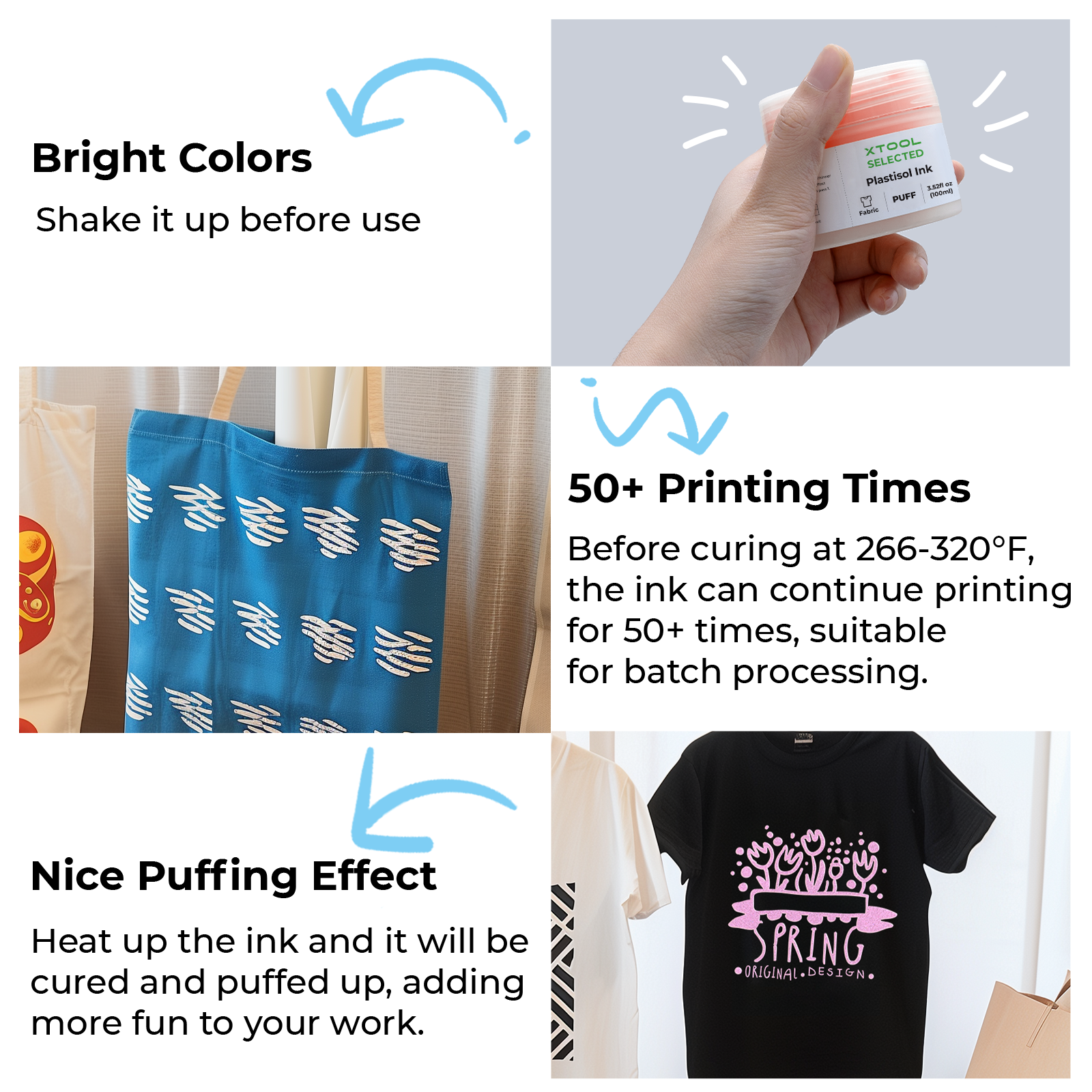 - Qualité professionnelle : Encres plastisol puff de qualité professionnelle, idéales pour les sérigraphes. Elles offrent des couleurs vibrantes et une excellente couverture. Cette encre peut être utilisée avec la presse à chaud xTool pour produire un effet de gonflement agréable lorsque chauffée.