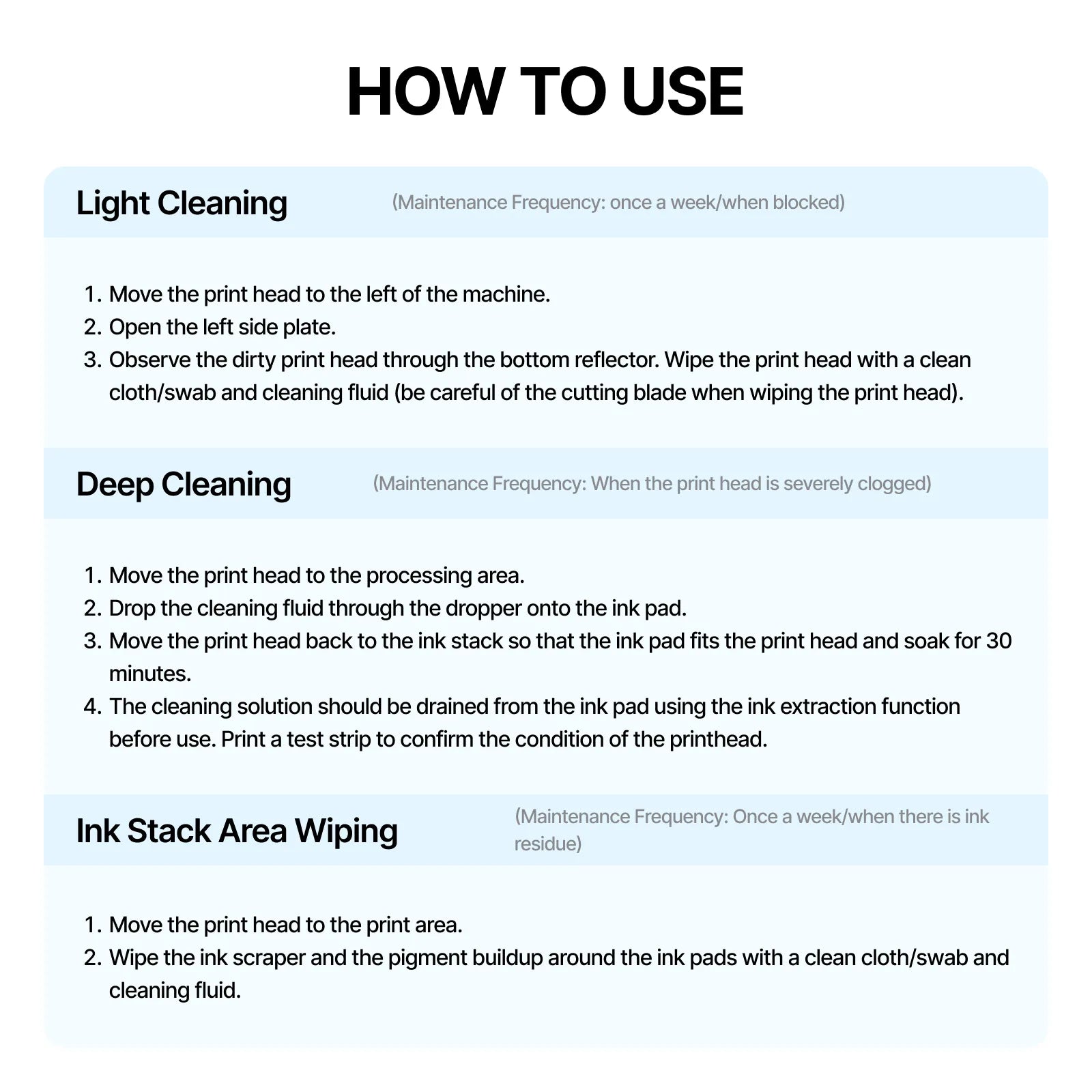 - Certification MSDS (SDS). Résout efficacement les problèmes de bouchage tenaces de la tête d'impression de l'imprimante xTool Apparel ou de résidus d'encre provoquant des changements de couleur, l'incapacité d'imprimer certaines couleurs, une faible qualité d'impression et des lignes pendant l'impression, rétablissant ainsi les performances de l'imprimante à son état optimal. Cela protège également la tête d'impression, assurant un flux d'encre plus fluide et prolongeant sa durée de vie.
