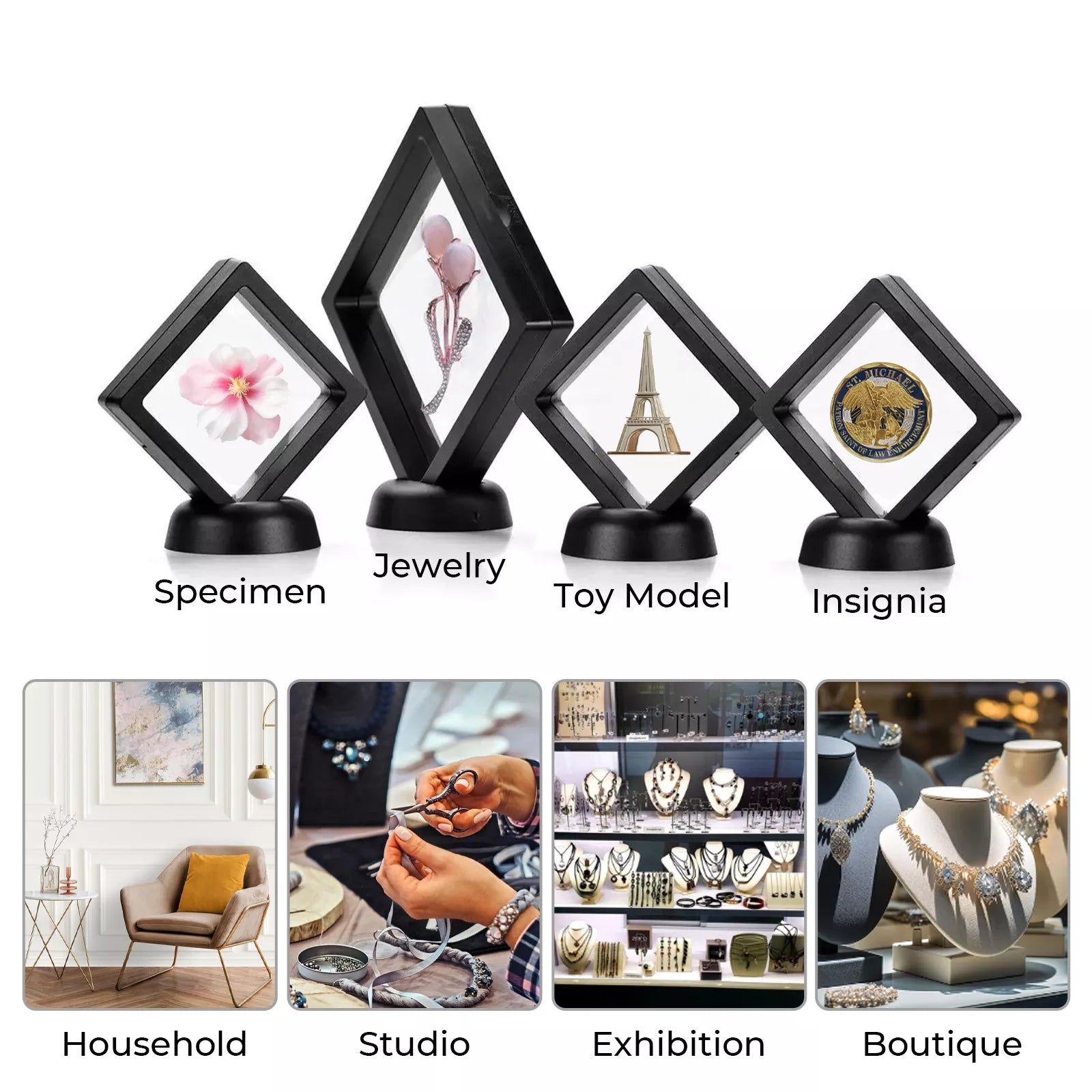 - Les objets d’exposition sont pris en sandwich entre deux films plastiques transparents et flexibles afin de créer un effet flottant en 3D. Ils peuvent être montés avec le support inclus pour offrir une présentation originale sur une table.