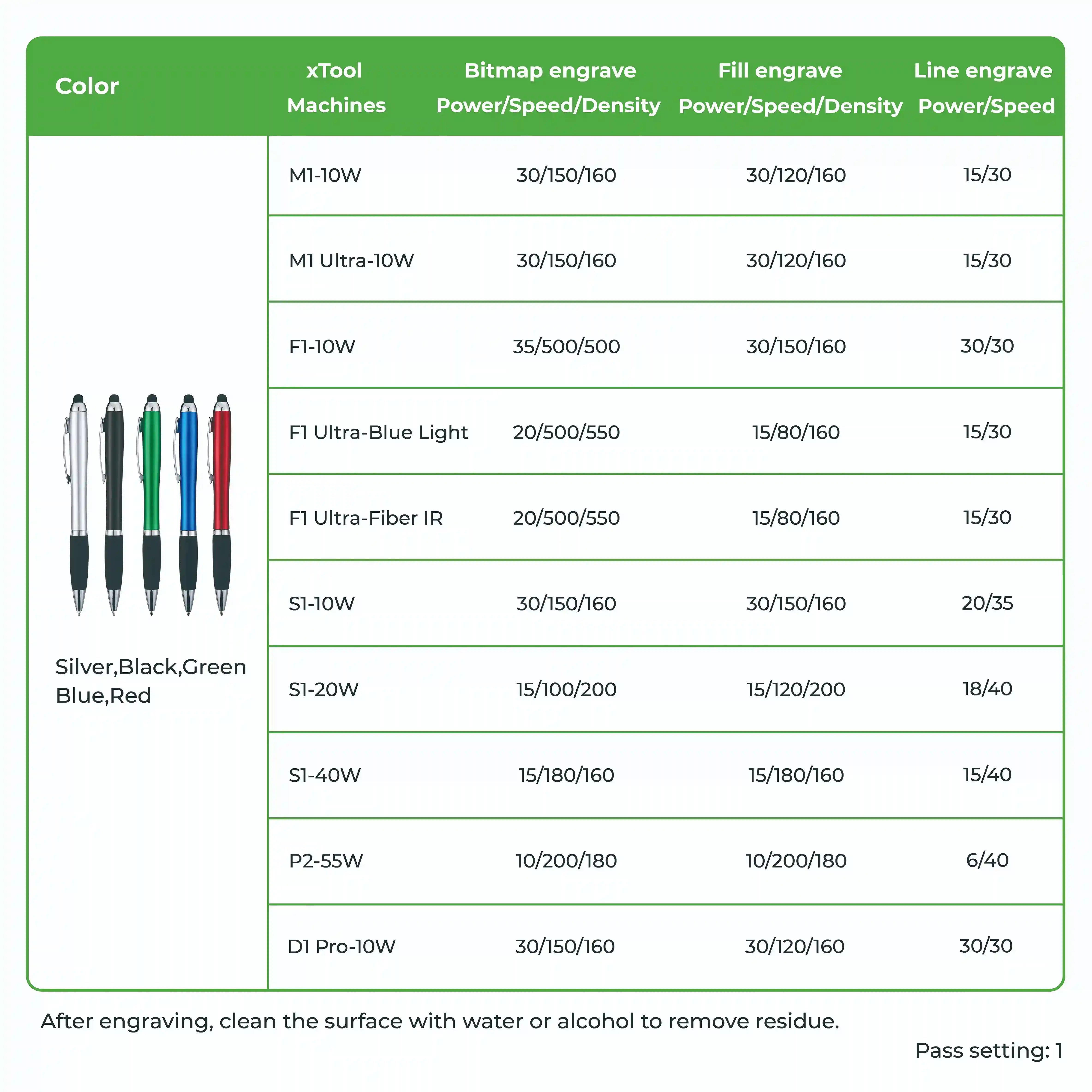 - Le stylo à bille tactile est équipé d’une lumière LED parfaitement adaptée aux machines xTool pour la gravure laser. Il suffit de graver des motifs ou du texte sur le corps du stylo pour obtenir un motif lumineux très cool. Un bouton situé à l’extrémité du stylo permet de contrôler la lumière. Pour des performances et une durée de vie optimales, nous recommandons d’éteindre la lumière lorsque le stylo n’est pas utilisé.