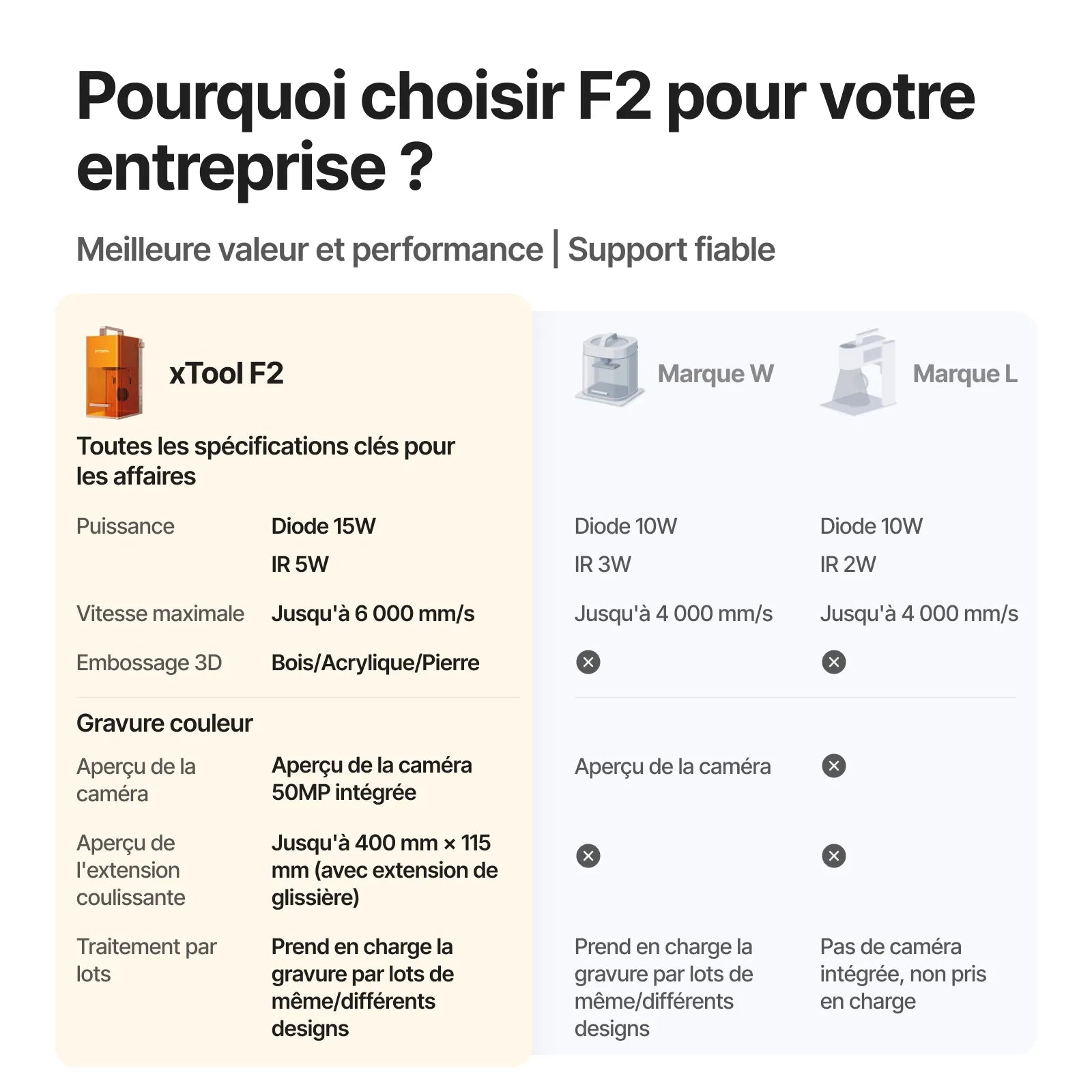 Oui ! Il est compatible avec tous les accessoires du F1, à l'exception de la mallette de transport rigide à roulettes. Votre investissement précédent n'est pas perdu : le F2 s'intègre parfaitement à votre écosystème xTool existant.